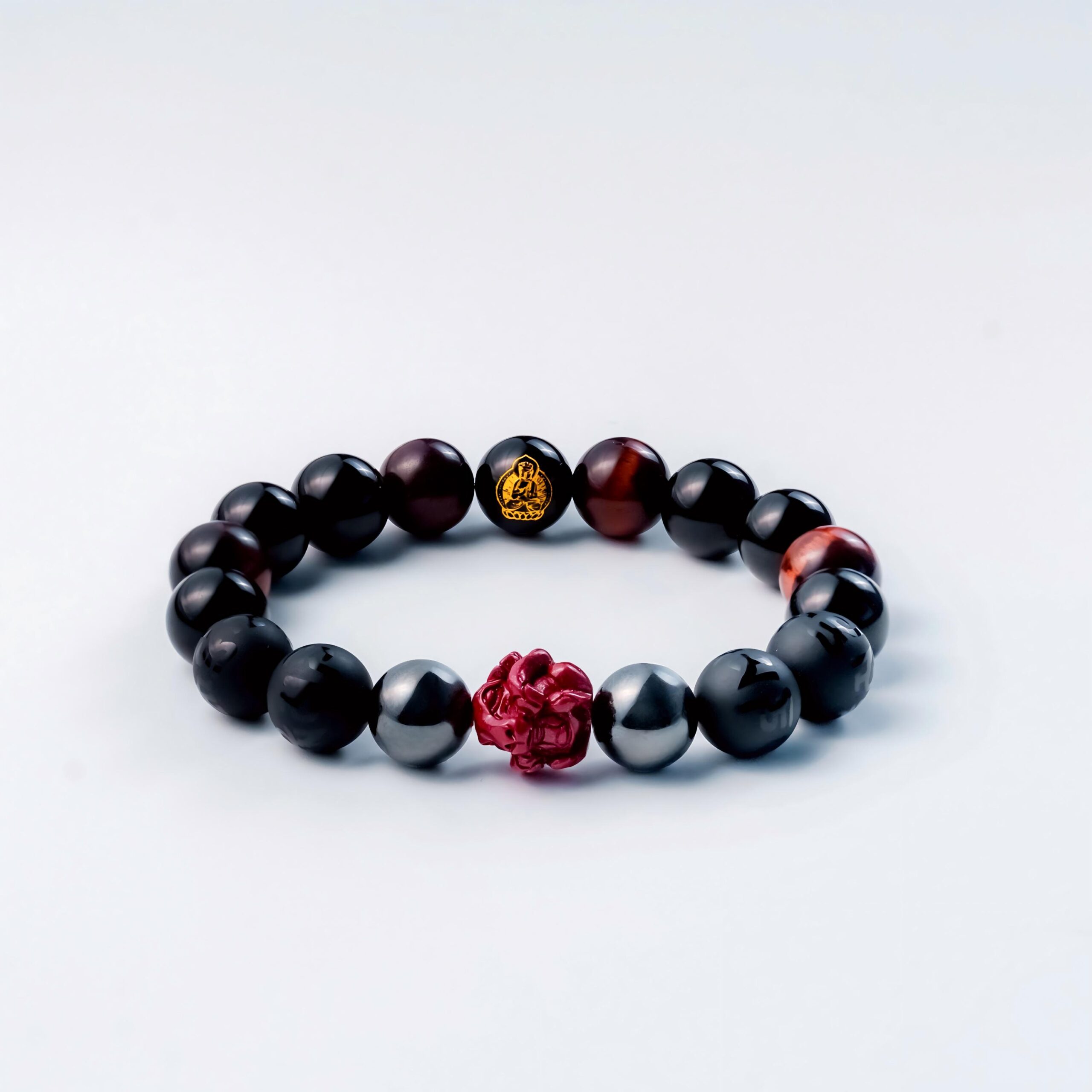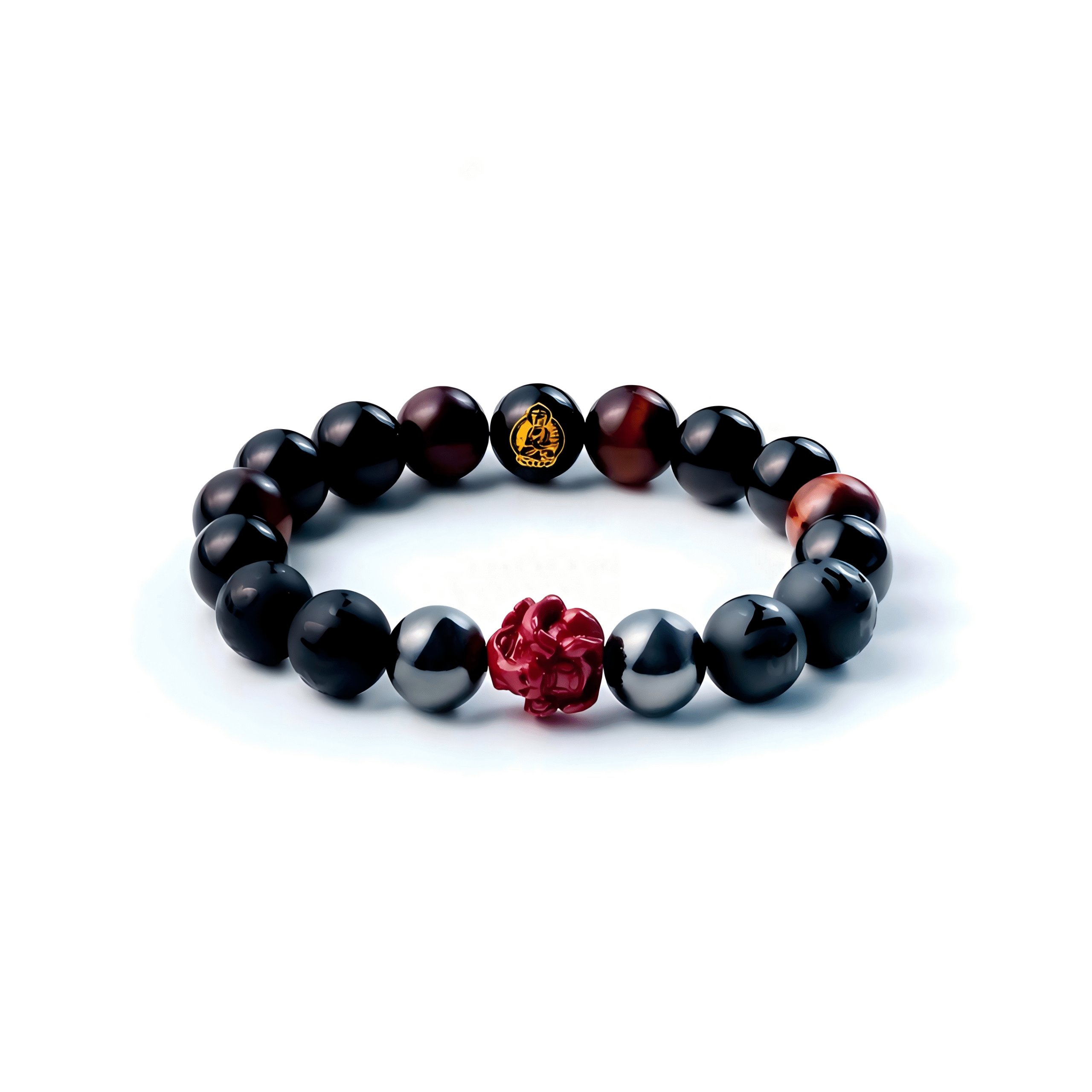 链身珠子层层递进,每一颗都藏着专属力量。天磁石圆珠温润亲肤,其蕴含的自然能量可净化身心浊气,平衡情绪起伏,让忙碌生活中始终保持从容姿态。黑玛瑙紧随其后,墨色深沉如夜,自带辟邪挡煞的气场,更象征着坚韧品格,助你在挑战中稳住心神、稳步前行。