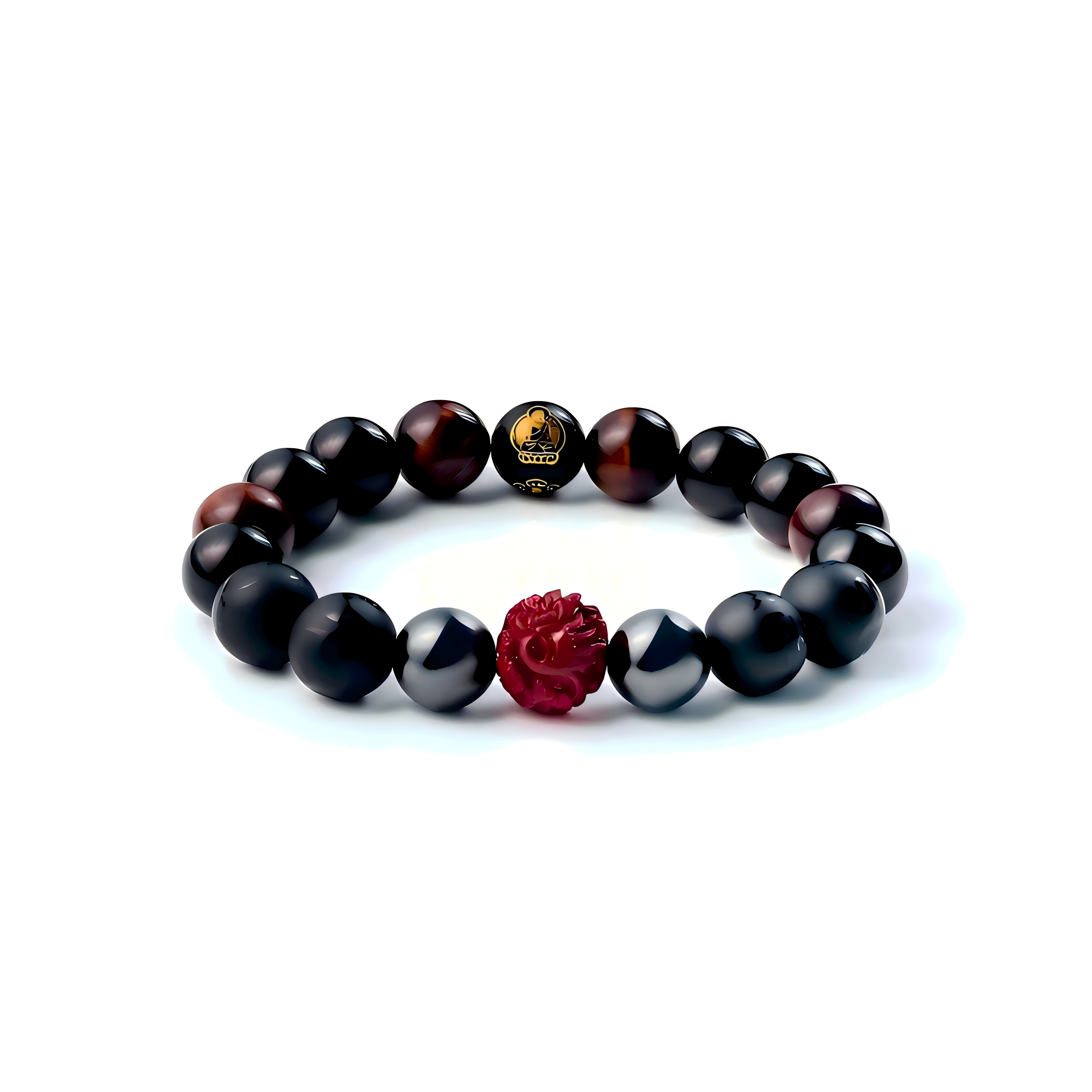 链身珠子的搭配更是暗藏巧思:天磁石圆珠流转着自然能量,助力净化身心浊气,平衡情绪波动,让身心始终处于平和状态;黑玛瑙的深邃光泽沉稳大气,兼具辟邪挡煞之效,更赋予人坚韧不拔的品格,守护前行之路安稳无虞;红虎眼石闪烁着灵动光韵,为佩戴者注入蓬勃活力与直面挑战的勇气,时刻散发自信气场。